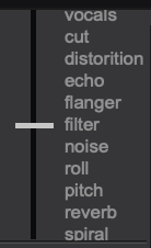 <text text="vocals\ncut\ndistorition\necho\nflanger\nfilter\nnoise\nroll\npitch\nreverb\nspiral" weight="normal" color="gray" fontsize="10"/>