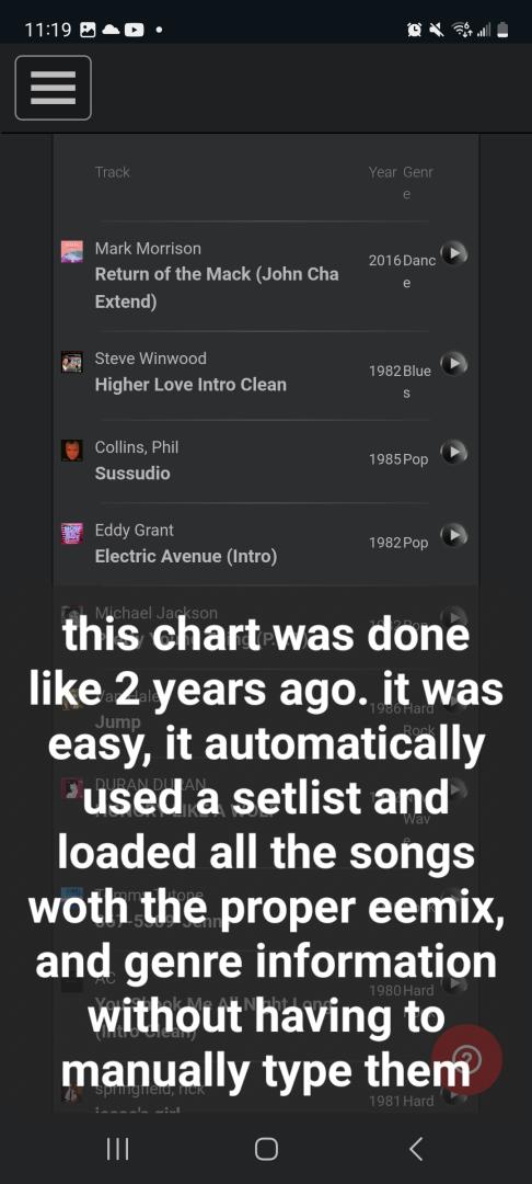 The community chart function has been broken for a while. It no longer lets you pick a setlist as a chart. Now you have to manually enter artist name and song instead of picking from your stored setlist. As most of us know, on average a 4 hour set has upwards of 100 songs, which makes it very difficult to type up 100 plus song artists, song names and specific remix. Pictures bwlow, as well as picture of a chart that had the songs automatically loaded from a setlist. Please fix this bug. Community charts is an excellent tool.