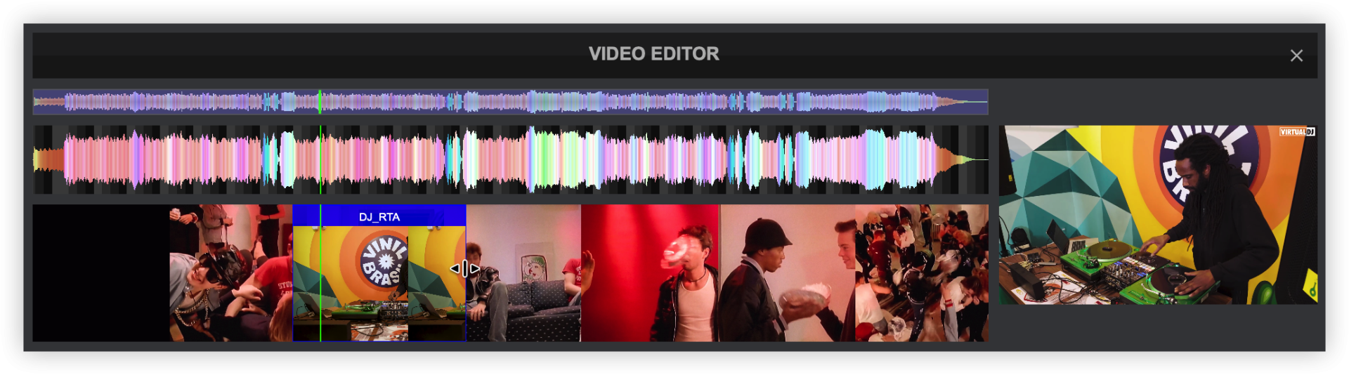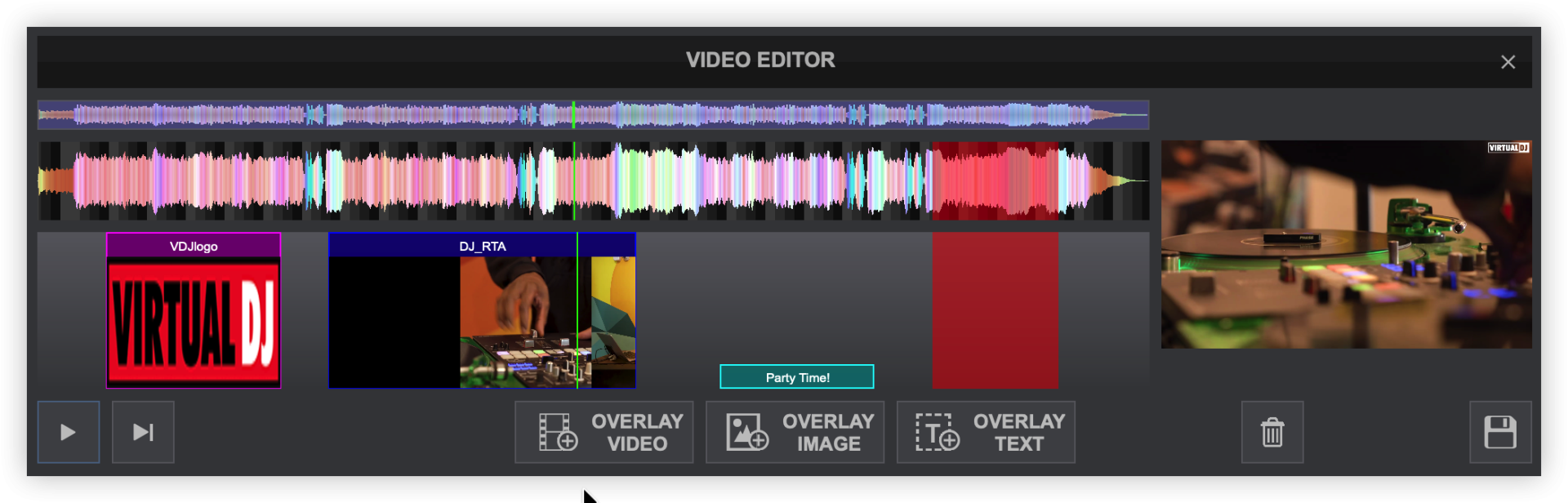 The Video Editor provides the ability to overlay video files and text over an existing Audio or Video track and is available as a Right-click option to any track in the File list. The process is non-destructive (does not alter the original file) and creates a special .vdjedit file that can be loaded to a deck and used in place of the un-edited original file.