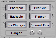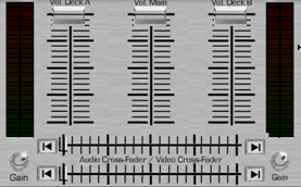 The Mixing desk which includes crossfaders for both audio and video with transition/jump buttons.