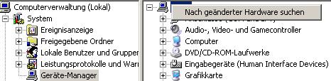 arbeitsplatz, rechte maustaste, verwalten, geräte manager, auf deinen namen, rechte maustaste, nach geänderter hardware suchen.