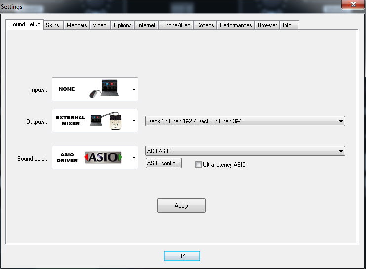 Der Faderstart ist nativ nicht gemappt, allerdings bin ich jetzt nicht so firm Dir sagen zu können, ob man das mappen kann. Ansonsten habe ich vorn auf 8-out gestellt (vor dem einschalten der VMS!) um mit meinem Skin bequem zwischen 2 oder 4 decks wechseln zu können. In der Config habe ich "Advanced Config" drin und da halt die Einstellungen des ASIO-Treibers.