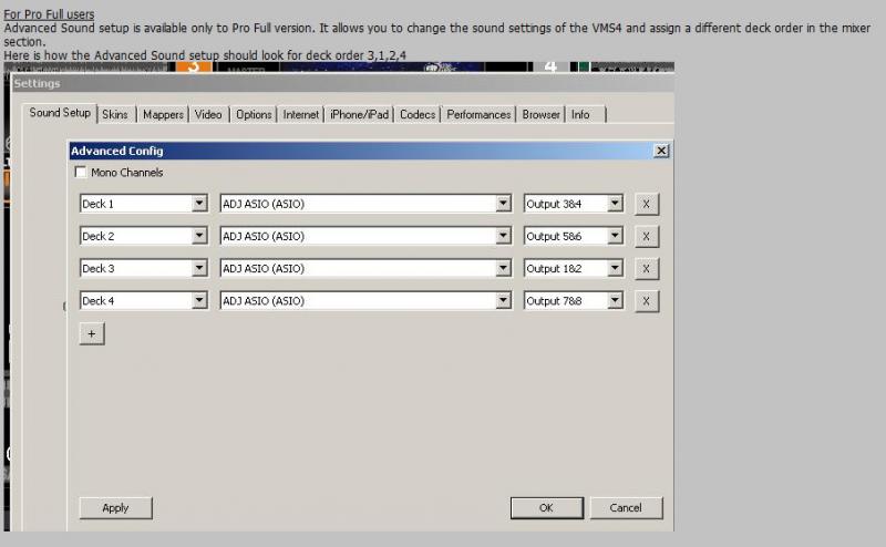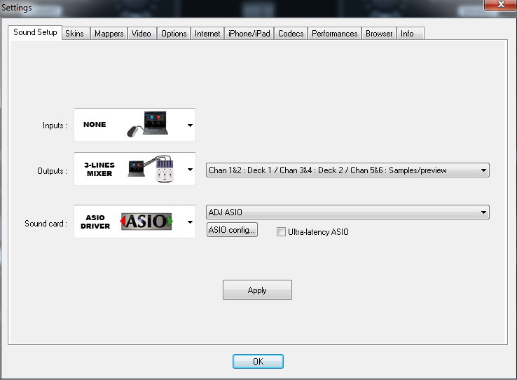 nun, das mag daran liegen, dass vielleicht das 2 Deck Skin nur 2 Decks unterstützt, und die anderen Skins eventuell 4 Deck kompatibel sind. Du hast ja einen 3 Kanal Mixer ( 3 outs ) und 2 ASIO Ausgänge konfiguriert. In der Soundconfig. sagst Du dann Channel 5&6 Samples + Preview, hast aber in den ASIO Settings nur 1&2 bzw. 3&4 geroutet. Da kann schon sein dass da mal ein Skin durcheinander kommt, vor allem da du die VMS im 4in-4out Modus betreibst d.h. 4out = 2 Stereokanäle als Ausgänge/ 4in= 2 Stereokanäle als Eingänge/ Line in. lt. deinen Einstellungen in der Soundconfig. bräuchtest Du aber noch mal 2 Stereokanäle für 5&6, also so wie Du es in der Soundconfig. vorgibst