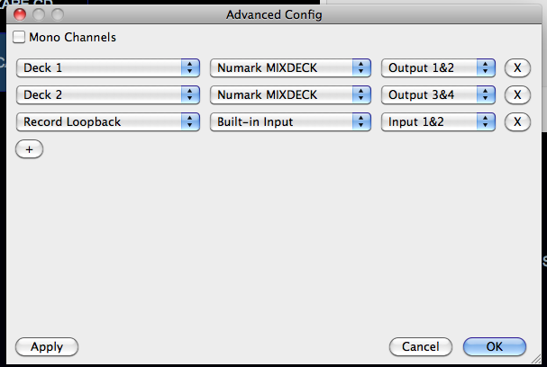 Ok. So is there any way that I can record with the mixdeck using the CoreAudio built in soundcard on the Mac? I have a Macbook from 2008. Currently I have everything plugged in correctly, mixdeck is up and going, but I can't get it to record correctly in the program. It basically doesn't respond to any volume fading I do on the mixdeck (since the onscreen volume faders are all the way up at all times). And whenever I try to set it up with the "record loopback" option, I get a CoreAudio sound card error. Any help?