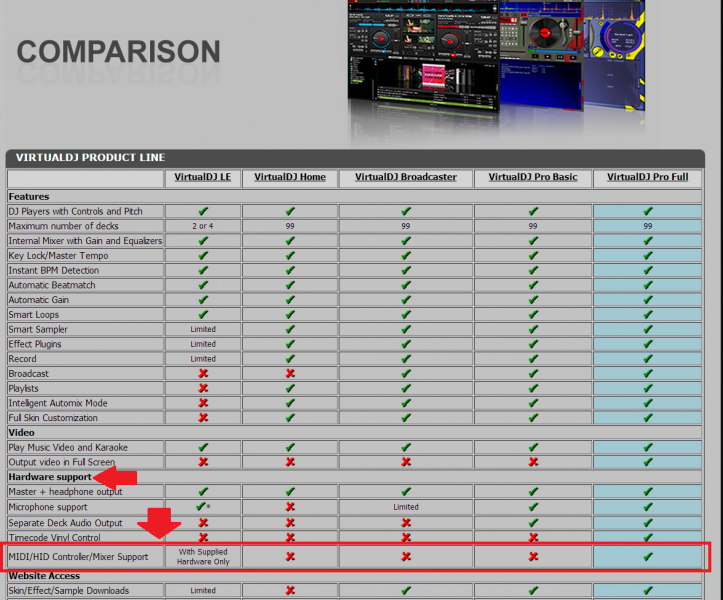 E repito a resposta resumida que escrevi antes, que vai um pouco além da informação mostrada no quadro. A resposta vai além pois considera o comportamento de qualquer plataforma do VirtualDJ (exceto LE e Pro Full) quando detecta um controlador MIDI. Neste caso, o programa entra em modo de teste e funciona como VirtualDJ Pro Full por 10 minutos.