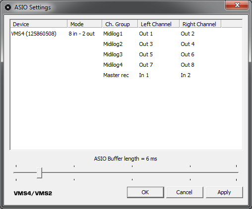 if you want the mixer to affect the audio and your using windows, you need to switch console mode.. when on your desktop turn on your VMS4.1, hold down midilog 4 cue button for 5 seconds and turn your VMS4.1 off while still holding down cue, then hold down midilog 4 cue again and turn the VMS4.1 back on and hold it down for another 5 seconds, and the number in the ASIO control panel should start with a 0 instead of 1