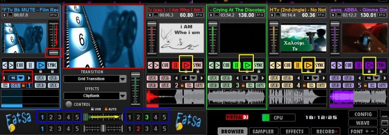 Simply, Deck 1 is my ALWAYS on MUTE Deck with the ability to create a great visual when I push the fader up a little and the remaining 4 Decks are my Players with the VIDEO FADER (Yellow Arrow) going Left To Right depending what's on. I just need to click PLAY & GO LIVE without assigning a deck.