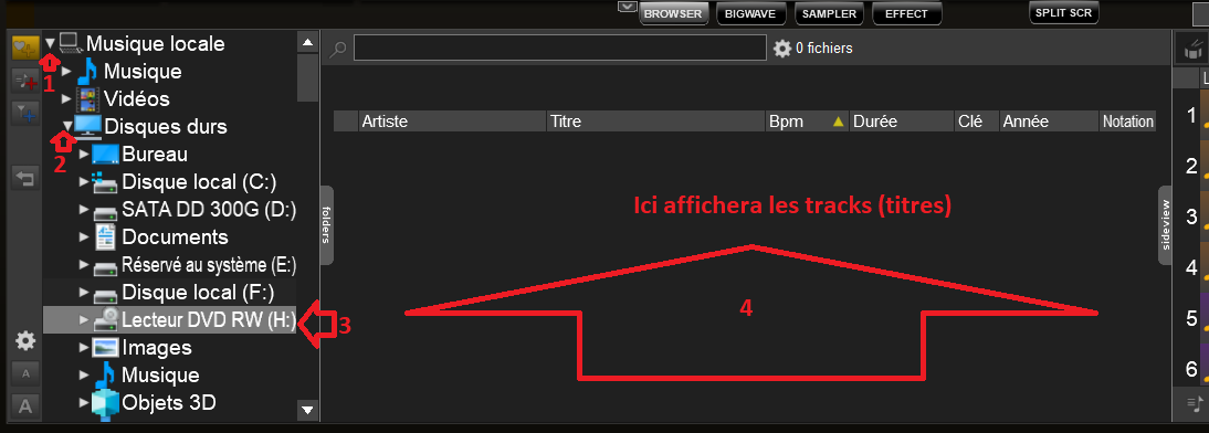 clic sur la flèche de l'icone Musique local / clic sur la flèche icone disques durs / clic sur l'icone Lecteur DVD RW, puis affichera les tracks du DC