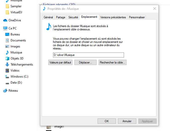 Je les aient déplacé sur D:\olive\Musique et j'ai fait un lien de préplacement dans propriétées déplacement.