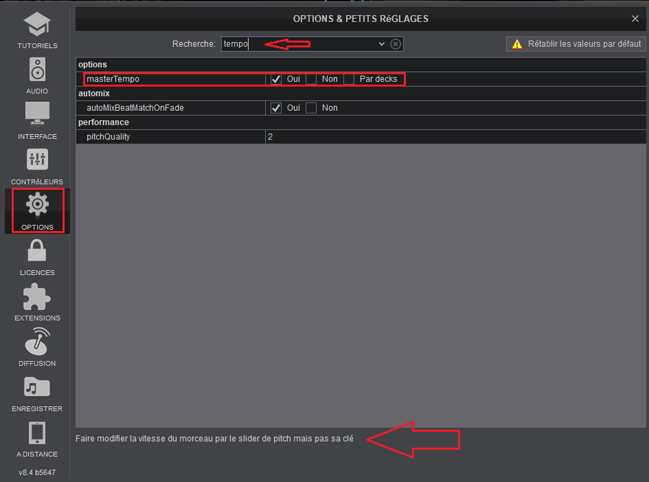 L'option MasterTempo doit être sur Oui au lieu de Non