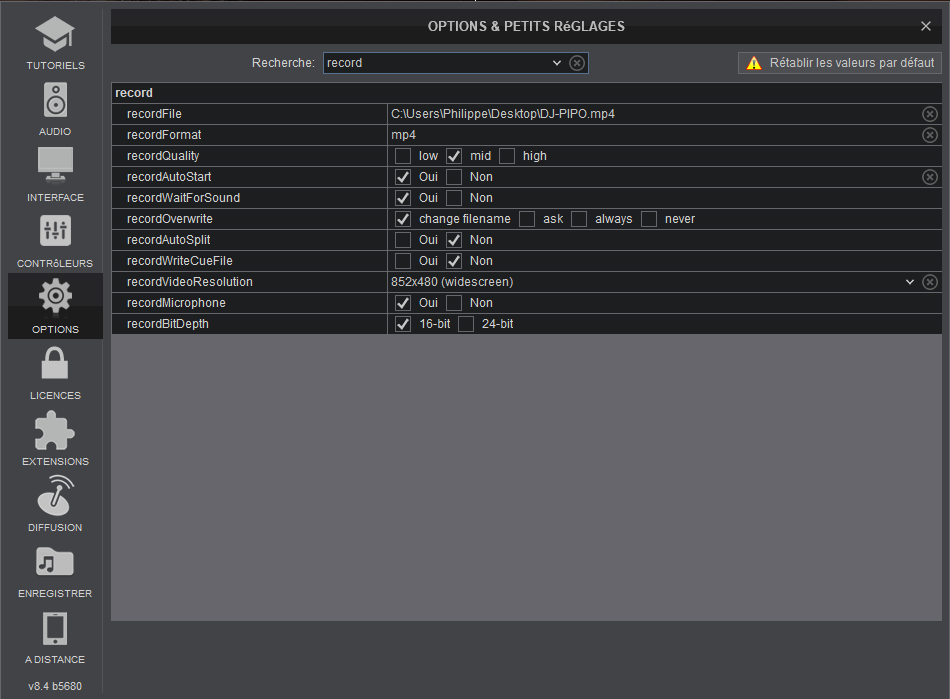 Dans l'option en tapant record voir si tu as les même option cocher