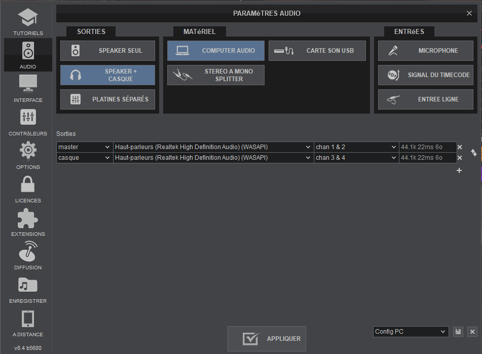 si vous utilisez la carte son du PC, et vous n'avez pas de controleur et vous utilisez vdj et la souris.