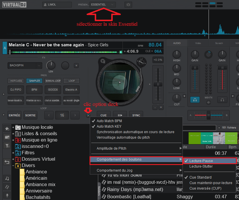 choisissez la skin Essentiel par defaut de vdj2020 puis clic sur le bouton Option de deck