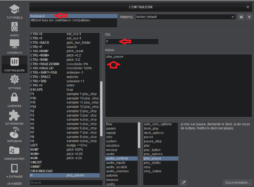 Le mapper par Factory defaut a déjà la touche P du clavier assigner est en play-pause.