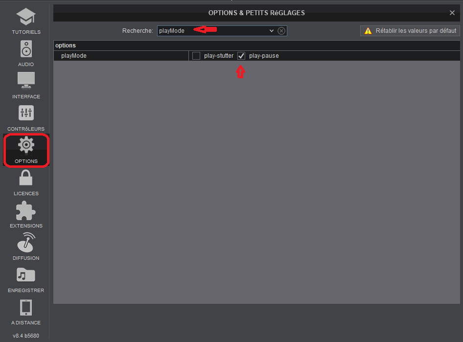 vous pouvez aller dans config / Onglet option et tapez dans la case de recherche playMode et cocher play-pause