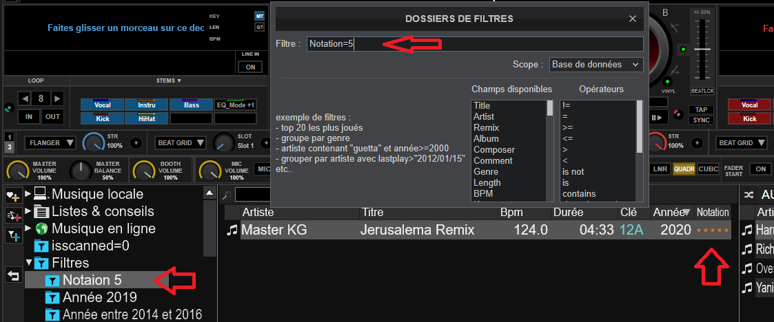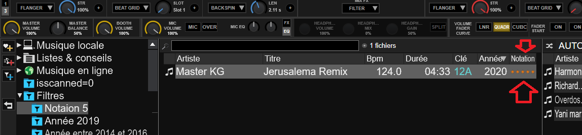 Dans la fenêtre filtre tu tapes notation=5 et apparaîtra les notations 5 étoiles