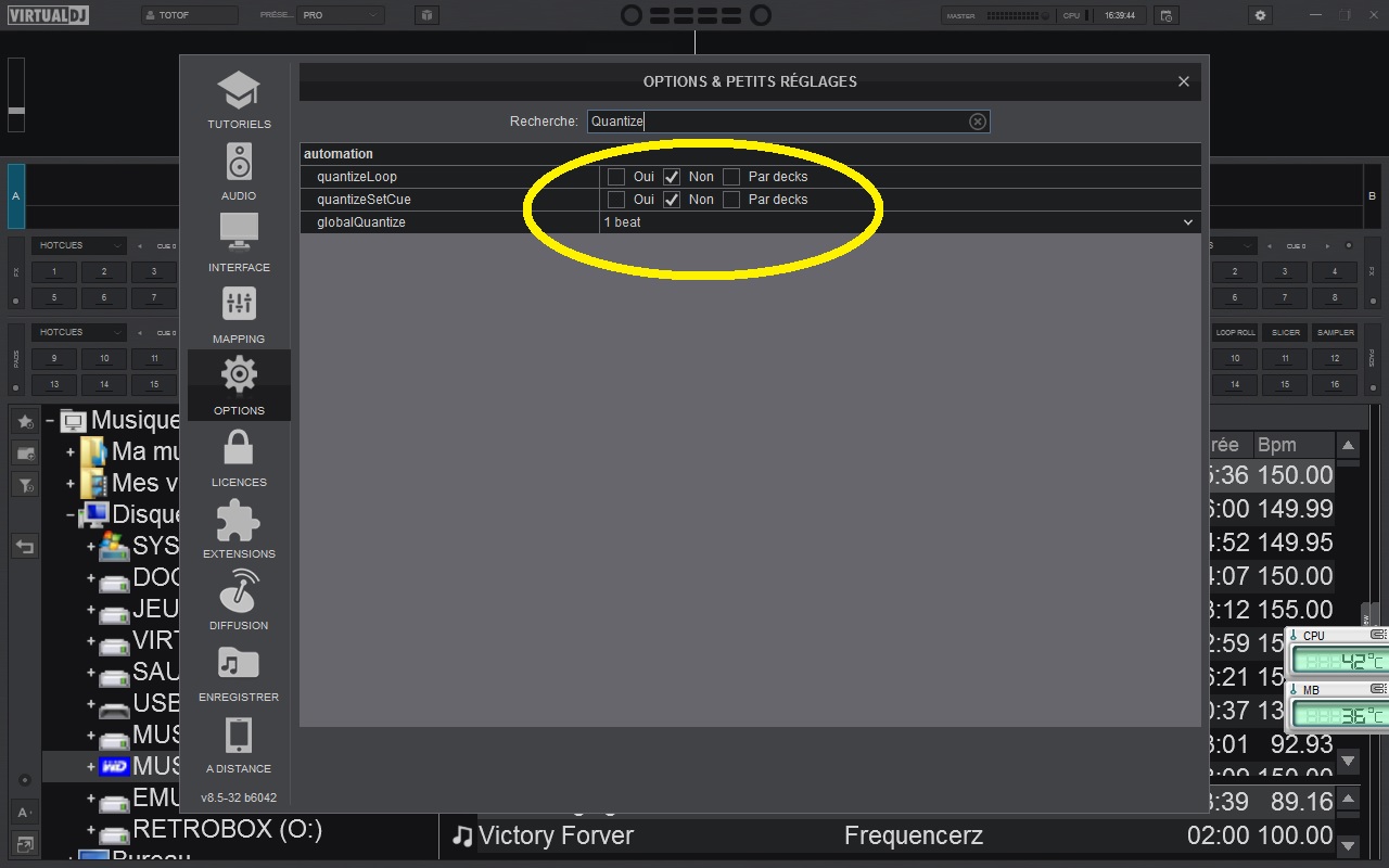 Depuis la mise à jour de virtual dj de la version build 6011à la version 6042 la fonction quantize est activé en permanence,impossible de désactiver,le bouton du contrôleur réagit,mais la fonction reste activé....si je revient à la version build 5980,je peux à nouveau activer et désactiver la fonction quantize via le controleur...