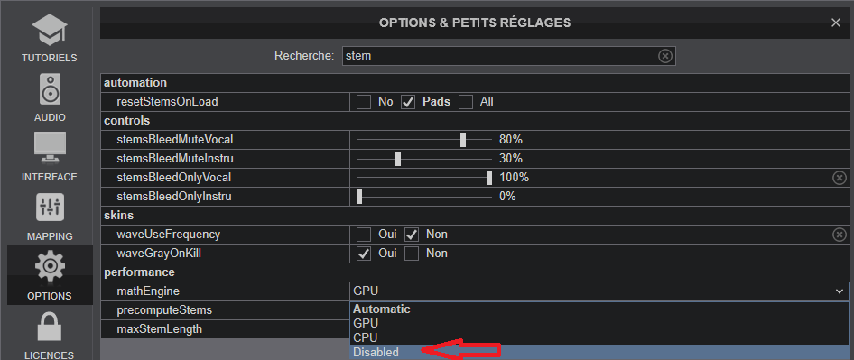 Pour désactivé les stems, taper stem dans la fenêtre config de VirtualDJ, puis MathEngine et disable (voir screen)
