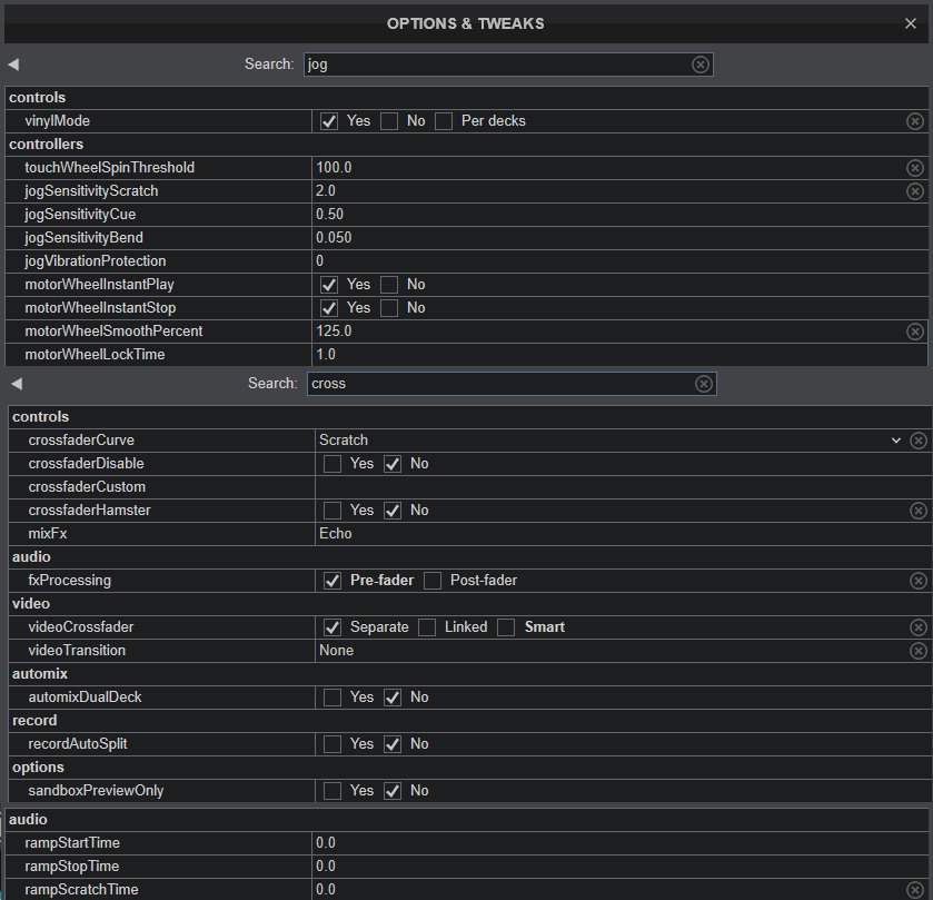 I have a RANE One and recently picked up a RANE Four. I have been tweaking settings in VDJ to get the best feel from the jog wheels and crossfader to get as close to the One as possible here are the settings I changed: