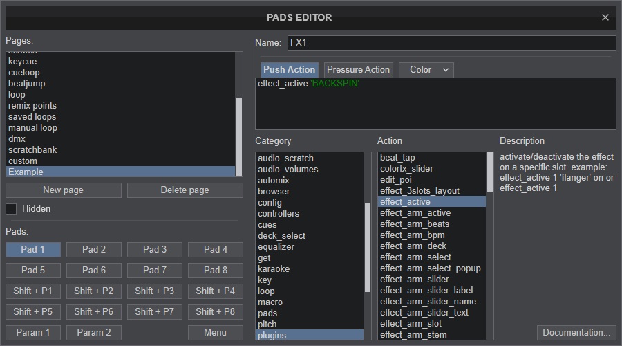 Figura 1 - abri o editor de pad e salvei uma NEW PAGE com o nome EXAMPLE, criei para o botão PAD1 acionar o efeito BACKSPIN ao pressionar, e dei o nome do botão como FX1