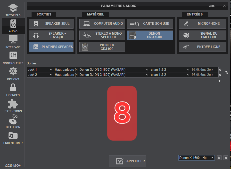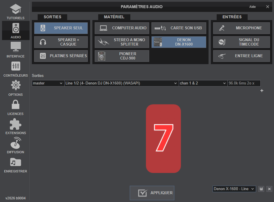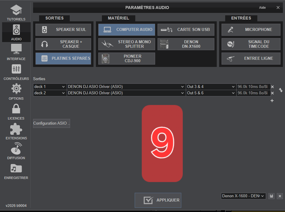 Quand je clique sur DN X-1600, dans les paramètres j'ai bien les pilotes Denon asio par défaut.