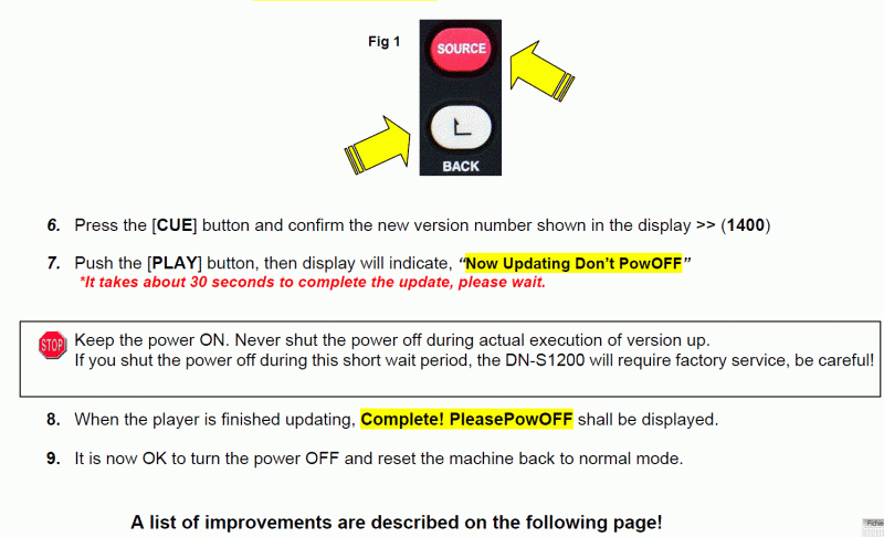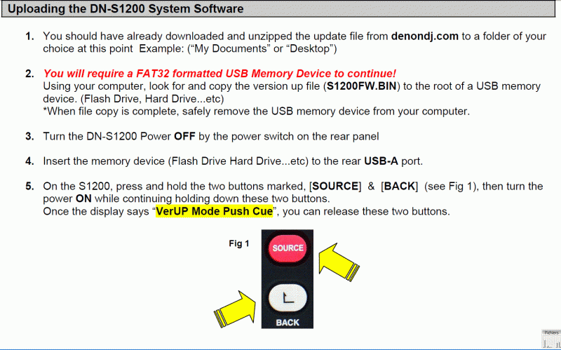 - sur la dn-s 1200 appuyer et maintenir les bouton SOURCE et BACK enfonceret allumer la platine, pendant l'allumage toujours maintenir les deux boutons enclencher j'usqu'a l'apparition " VerUP Mode Push Cue" on peut relacher les boutons.