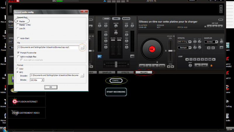 dans vdj tu va sur l'onglet RECORD ensuite sur config, et configure tout correctement (dans record from) ainsi que dans file en entre bien le titre du mix et aussi souviens toi ou tu l'enregistre ;)