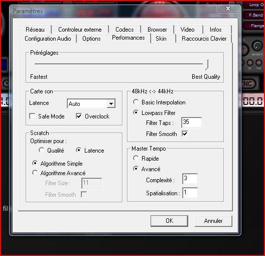 J\' ai un petit souci, alors que je mixe depuis pas mal de temps avec la version 6.01 j\'ai depuis deux jours des accrochages son sur les enceintes !!! Cela fait suis à une modif de paramétrages afin d\'essayer le mix de clip video. J\'avais du descendre pour l\'occasion la qualité son dans VDJ. Voici le paramétrage actuel (sachant que la semaine dernière j'avais encore la qualité son vdj max sans aucun accro)!!!! pouvez vous m\'aider à retrouver la pleinitude???