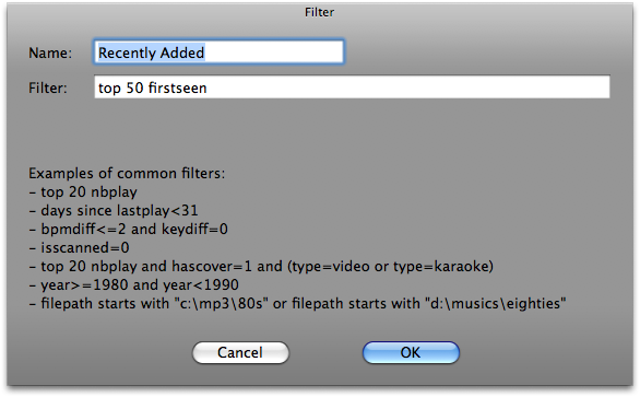 Elements "title", "author", "artist", "album", "genre", "year", "bpm", "key", "bitrate", "songlen", "filesize", "filepath", "filename", "extension", "hascover", "isscanned", "alreadyplayed", "lastplay", "firstplay", "firstseen", "nbplay", "type", "days since firstseen", "days since firstplay","days since lastplay", "LinkedVideo", "HasLinkedVideo", “BPMDiff”, “KeyDiff”, “ispresent”, “inSearchDB”