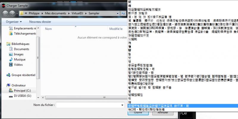3) lorsque que je veux charger un sample le menu load ne fonctionne plus normalement: la fenêtre est vide comme si aucun sample n'existait et lorsque j'ouvre le petit menu Tous les samples (en bas et à droite de la fenêtre) un drôle de menu rempli de caractères asiatiques s'ouvre (voir image jointe). Il faut que je ferme et ouvre à nouveau VDJ pour récupérer le menu des samples.