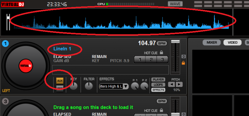 An exei to 2 Decks default skin tote me to pou patas to SOURCE koumpi tha prepei na sou energopoiei to AUX koumpi stin perioxi tou MIXER panel.