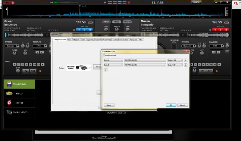 Hola, tengo un problema con mi mezcladora numark mixtrack pro. Al conectarla al virtual dj y tener la configuracion en entradas none, salidas la que sale un parlante y audifonos, y en tarjeta numark me señala error de directx y no me funciona, pero al configurarla en salida solo con parlantes y en tarjeta: simple funciona a la perfeccion la mesa pero no obtengo preescucha. Alguien que pueda ayudarme porfavor?