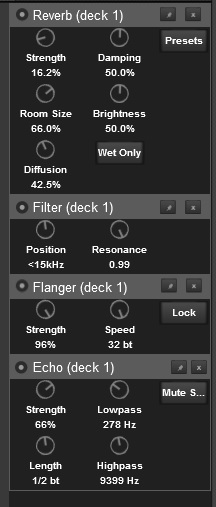 Así verás en todo momento los 3 efectos de los 2 decks activos, además de las dos primeras perillas de control de cada efecto.