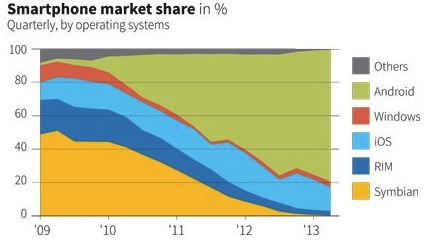 1. It is easy for Droid phones to win market share when many of them are given away free or cheap. I would love to see a tablet chart. Which is what this app should really be on.