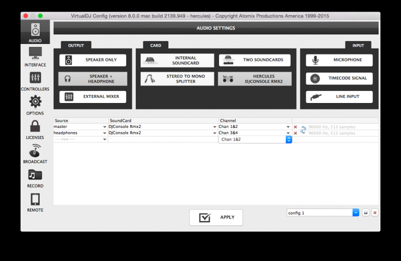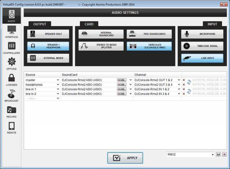 HI! I just got the Hercules RMX2, and the settings for my other Hercules aren't working. I use my HP laptop, and Hercules RMX2 into a Mackey Board. What should I set my config to? Currently the sound is coming out of my laptop only, but the Hercules is working to control things. Can anyone tell me what to set my config settings to?