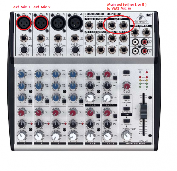 Whoah! If you're going to attempt this (connecting the main output of the Behringer to a mic input) make sure you keep the output volume level of the Behringer really low, because otherwise you'll just distort the signal by overloading the VMS mic input.