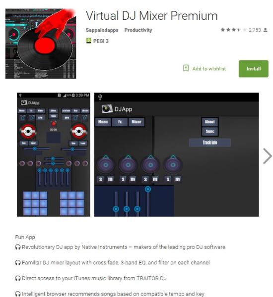 This app is called Virtual DJ Mixer Premium and the icon looks too familiar with a picture of a VDJ skin behind. Also states it is made by NI which is obviously untrue.