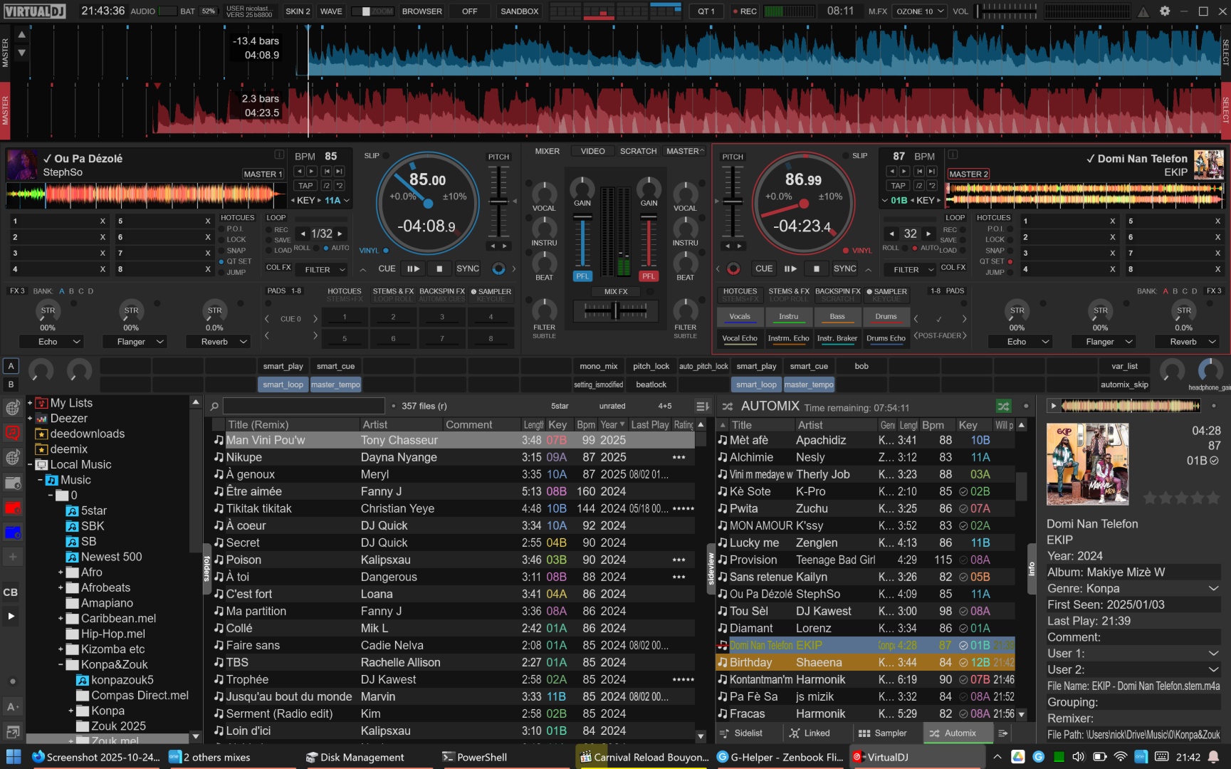 The point is it's convenient to be able to use Traktor's 4 stem format (1 track for full track, 4 stem tracks), without having to redo them. Also, Nuostems' algorithm (mel_band_rofomer+htdemucs_ft) is still better than VDJ's (at least last time I checked), but doesn't do separate kick/snare.