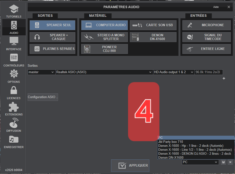 Quand je clique sur DN X-1600, dans les paramètres j'ai bien les pilotes Denon asio par défaut.