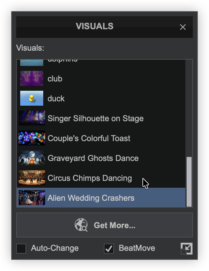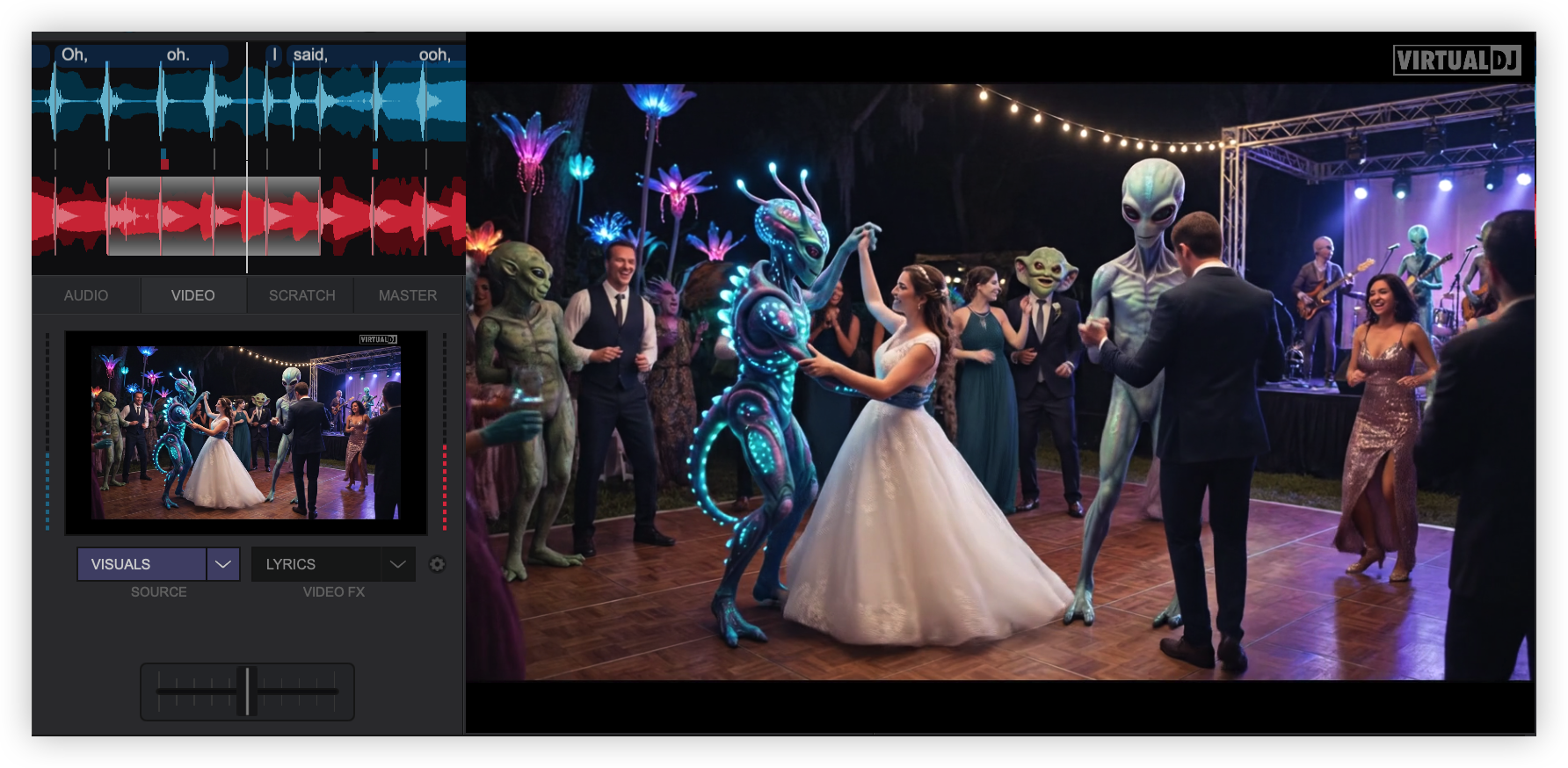 Visuals provide the ability to display AI video loops and audio-reactive patterns on the master video output that move with the music in real time. Visual content can be downloaded from a user-created library or created within VirtualDJ.