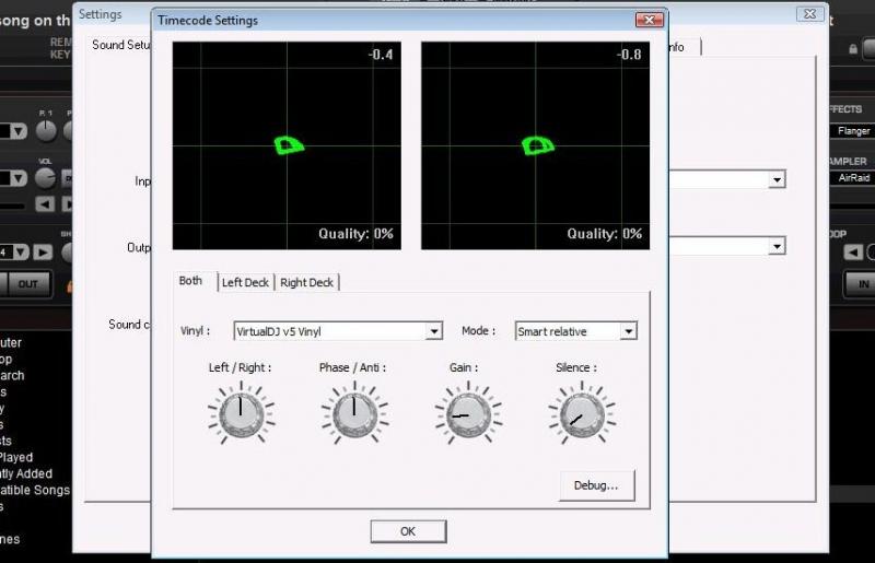 Thanks!! Now it works with Virtual Vinyl v4 vinyl mode BUT NEXT PROBLEM is that the signal keeps jumping from 0% to 100% - music plays flawless but voice is metallic. This must be just because it keeps jumping from 0 to 100?? - What to try next?? - Why can´t i run with this virtual vinyl v5 mode??