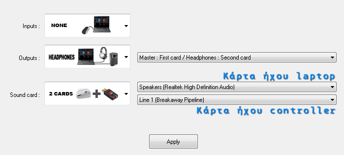 Εκανα και αυτο που λετε στο παραπανω τοπικ δηλαδη εφαλα τετραφωνικη μετα sound setup και διπλα καρτα ηχου αλλα τιποτα.στις επιλογες του virtualdj στην sound card θα επρεπε να με βγαζει το controller ως καρτα ηχου ολοι αυτο μου λενε αλλα δεν μου βγαζει κατι τετοιο εμενα..mono seperated,2cards,4,1,ASIO ενω πιο πανω βαζω None και Headphones....