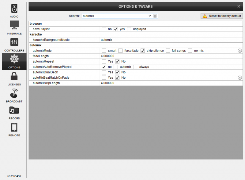 v8.2 b3409Καλημέρα σε όλους. Εγκατέστησα την 8.2 και σήμερα που πήγα να παίξω παρατήρησα οτι δεν λειτουργεί το prelisten. Δηλαδή πατώντας στην SR το Push button, δεν ξεκινούσε το prelisten. Και το δεύτερο παράξενο είναι οτι όταν έβαζα κομμάτια στο automix με επιλογή μίξης back-to-back, σε κάθε αλλαγή τραγουδιού κατέβαζε το pich στο +5,7