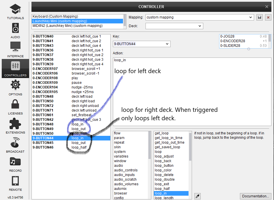 I am in the process of mapping a midi controller to use for cues and loops! I am having trouble mapping the loops. I can map the left deck fine, but when i try to map the cues for the right deck they end up looping the left deck. I can not seem to find a way to differentiate between the decks.