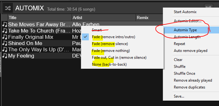 Thanks. You are very helpful.. I will look into them. May be you can help me with a problem i deal with 'Automix Type'. When i set it to Smart it tends to change by itself to Smart(cut), Smart(fade) or Smart(tempo). I couldn't find a way to set it manually to the setting i want and remain to that setting.