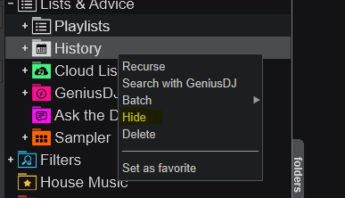 I just tried on my system, hiding one of the history folders via Windows. Makes no difference, still shows in VDJ.