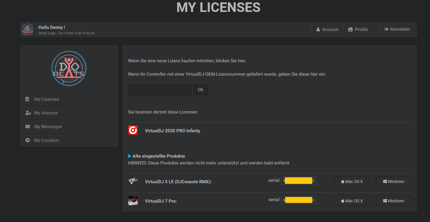 die logindaten sind ja nicht das thema sondern die seriennummern für meine lizenzen sind weg auch hier im profil steht nichts mehr drin die sind einfach raus und das verstehe ich nicht wo sind sie hin weil vdj keine pro erkennt sondern nur eine home lizenz das will mir nicht in den kopf hat mich irgend jemand gesperrt oder warum und danke an das team für das neue passwort das funktioniert nur meine pro infinity lizenz wird immer noch nicht angezeigt leider oh mann ich gebe auf ehrlich jetzt habe ich meine sämtlichen dvds wo ich gesichert habe da war doch tatsächlich eine serien nummer da kommt dann das This serial is not valid anymore.You currently don't have any license registered with this account.