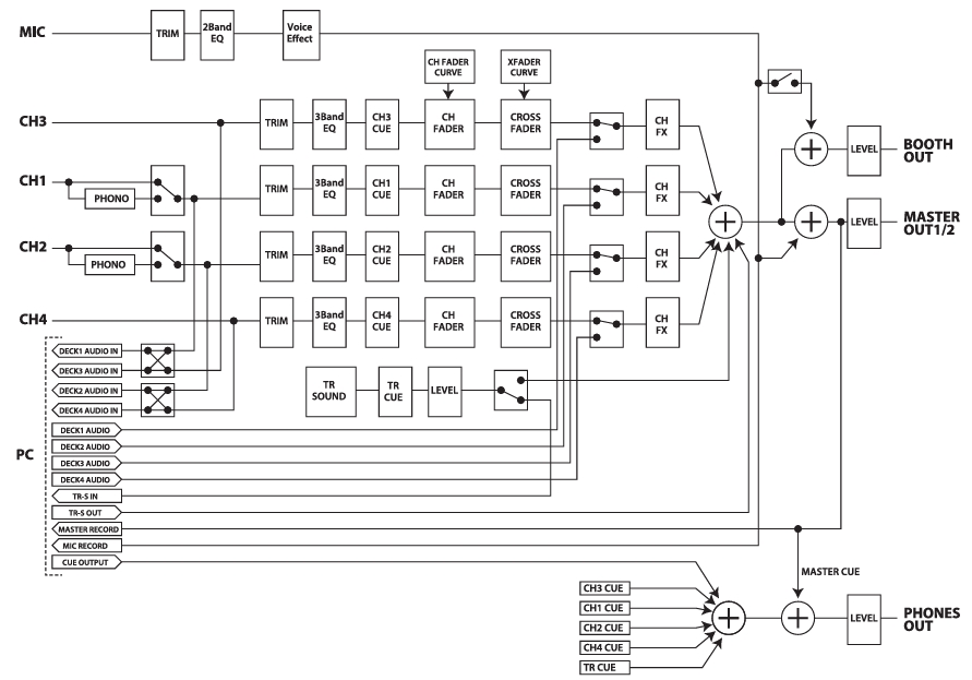 The rest of mixing (gain, eq, colorfx, levels) is done by the controller with it's hardware.