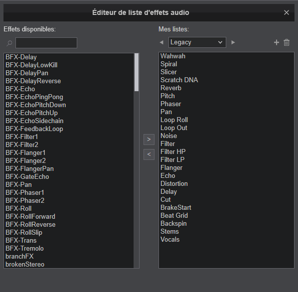 Il y a une liste défaut (effets par défaut dans VirtualDJ), une liste de tous les effets legacy + effets installés + les nouveaux effets Pioneer et Rane :