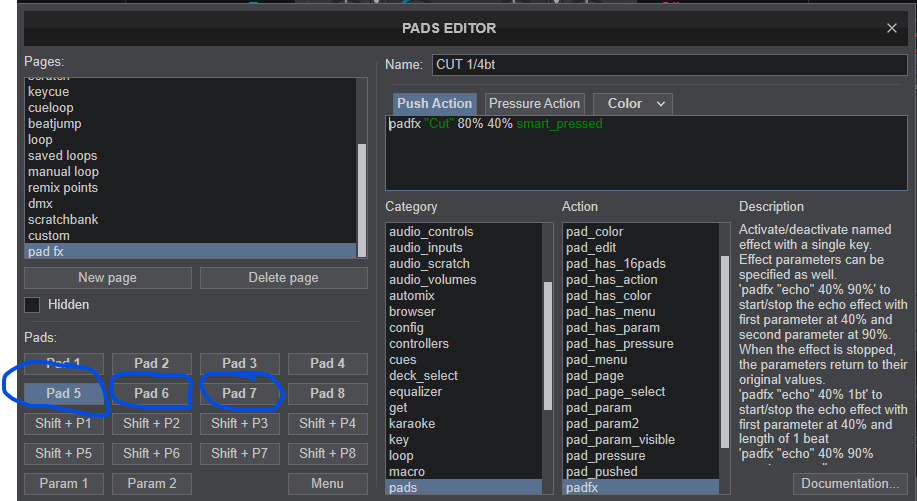 With PAD FX ACTIVE, pad #5 (CUT 1/4bt) not doing anything no effect whatsoever, pad #6 (CUT1/2bt) and pad #7 (CUT 1bt) when I press on it sounds like a static beat into 100% STR AND when Iet go it goes back again to the default parameters. Here is what I did based on the interpretation of your instructions, and by way It worked! The pads are working back again...!